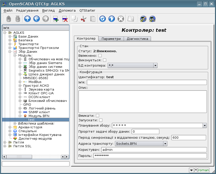 Для додання джерела даних у OpenSCADA створюється та конфігурується об'єкт контролеру. Приклад вкладки конфігурації об'єкту контролера даного типа зображено на рисунку 2.
