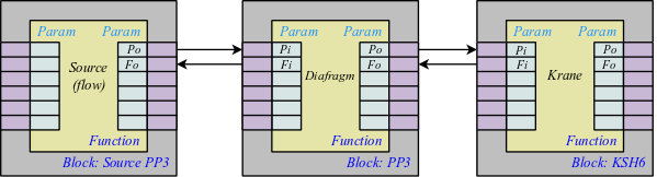 Умовно з'єднання блоків можна зобразити як зв'язки між блоками в цілому (рис. 1) або деталізація зв'язків (рис. 2). В процесі зв'язування параметрів блоків допустимо з'єднання параметрів будь-якого типу. При цьому, в процесі обчислення буде виконуватися автоматичне приведення типів.