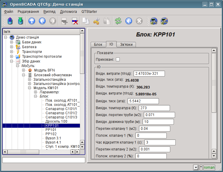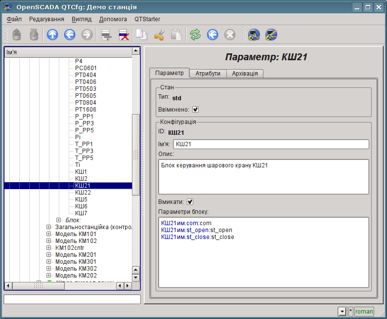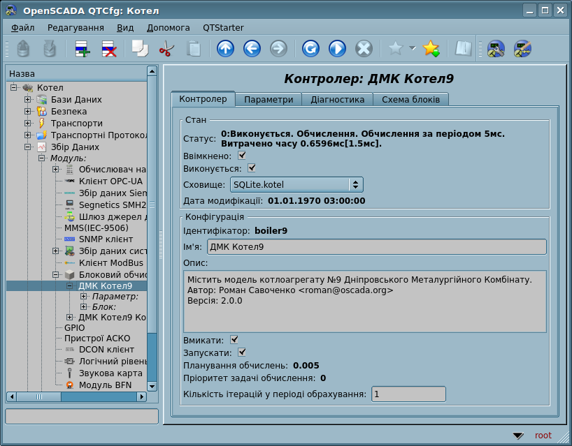 Кожен контролер цього модуля містить блокову схему, яку він обраховує із зазначеним періодом. Для надання обчислених даних в систему OpenSCADA в контролері можуть створюватися параметри. Приклад вкладки конфігурації контролера даного типу зображений на рис.3.