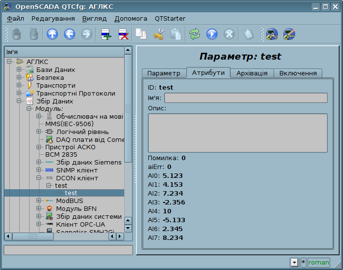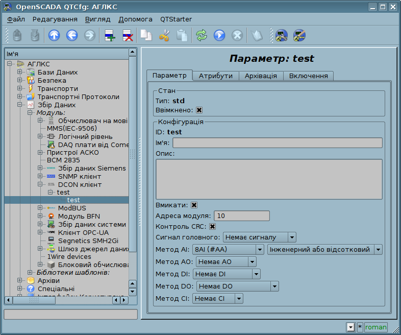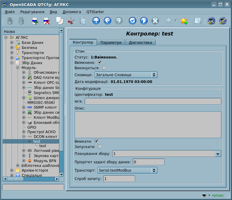 Для додання джерела даних DCON створюється та конфігурується контролер у системі OpenSCADA. Приклад вкладки конфігурації контролера даного типу зображено на рис.1.
