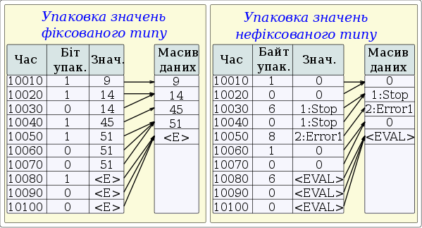Роз'яснення механізму послідовної упаковки наведено на рисунку 7. Як можна бачити з рисунку, ознака упаковки містить довжину (нефіксовані типи) або ознаку упаковки (фіксовані типи) окремо взятого значення. Це означає, що для отримання зміщення потрібного значення необхідно скласти довжини всіх попередніх дійсних значень. Здійснення цієї операції кожний раз та для кожного значення є дуже накладною операцією тому було запроваджено механізм кешування зміщень значень. Механізм кешує зміщення значень через визначену їх кількість, а також кешує зміщення останнього значення, до якого здійснювався доступ (окремо на читання та запис).