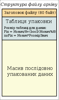 Згідно до вищенаведених вимог, організовано архівування методом множинності файлів (для кожного джерела). Циклічність архіву реалізується на рівні файлів, тобто створюється новий файл, а самий старий видаляється. Для швидкого стиснення використовується метод притягнення до останнього однакового значення. Для цих цілей у файлі архіву передбачається бітова таблиця упаковки розміром один в один із кількістю збережених даних. Тобто, кожний біт відповідає одному значенню у архіві. Значення біту вказує на наявність значення. Для потоку однакових значень біти обнулено. У випадку із архівом рядків, таблиця є не бітовою а байтовою та містить довжину відповідного значення. У випадку надходження потоку однакових значень, довжина буде нульовою та читатися буде перше однакове значення. Оскільки таблиця байтова то архів може зберігати рядки довжиною не більше 255 символів. Таким чином, методики збереження можна розділити на методику даних фіксованого та нефіксованого розміру. Загальну структуру файлу архіву наведено на рисунку 6.