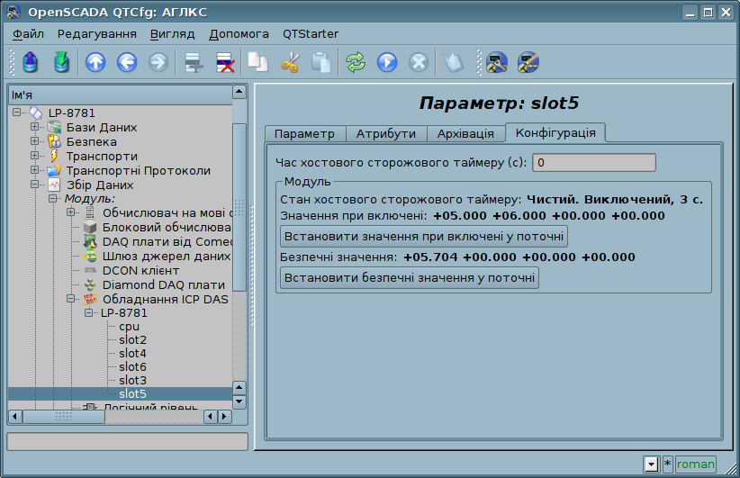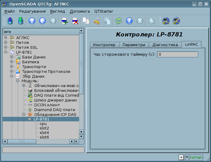 Для конфігурації властивостей контролерів серії LP-8xxx передбачено вкладку "LinPAC" на сторінці контролеру (рис.4), а також параметр "LP-8xxx" (рис.5). У параметрі "LP-8xxx" можна отримати інформацію про серійний номер контролеру, версії SDK, значенні DIP та поворотного перемикача. У вкладці "LinPAC" можна встановити значення сторожового таймеру контролеру. Сторожовий таймер контролера вимикається становленням нульового значення. Оновлення значення сторожового таймеру здійснюється у завдані контролеру та з її періодичністю, відповідно зависання задачі опитування призводить до перевантаження контролеру! Значення сторожового таймеру повинно бути більш за повний час завантаження системи, до завантаження OpenSCADA, при цьому OpenSCADA має вантажитися після запуску синхронізації часу.