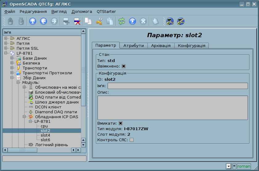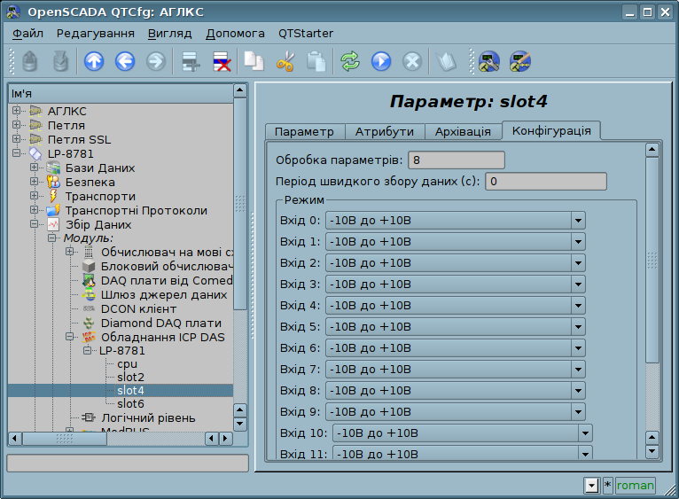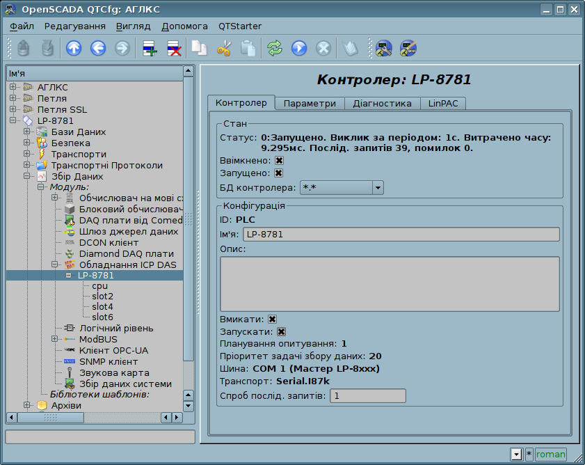 Для додання джерела даних "ICP DAS" створюється та конфігурується контролер у системі OpenSCADA. Приклад вкладки конфігурації контролеру даного типу зображено на рис.1.
