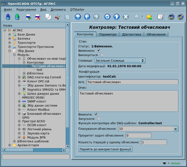 Об'єкт контролеру цього модуля, для забезпечення безпосередніх обчислень, пов'язується з функціями із бібліотек, побудованими за його допомогою, або з шаблоном збору даних. У випадку з шаблоном збору даних, додається можливість зовнішнього зв'язування, з іншими параметрами та атрибутами підсистеми "Збір даних". Для надання обчислювальних даних до OpenSCADA, у об'єкті контролеру можуть створюватися параметри. Приклад вкладки конфігурації об'єкту контролеру даного типу наведено на рисунку 2.