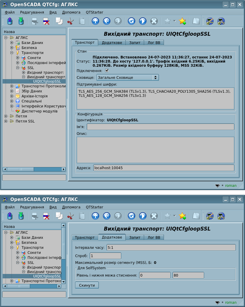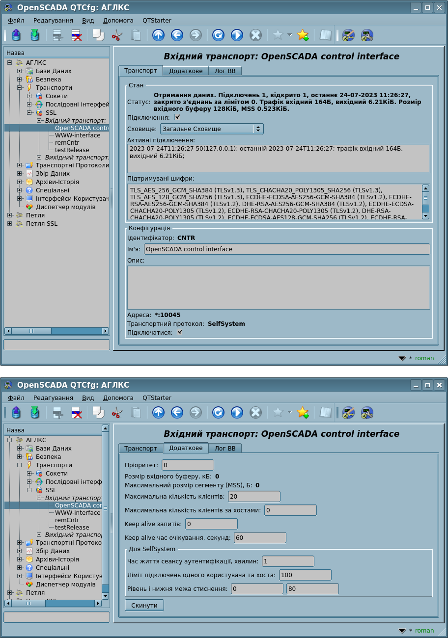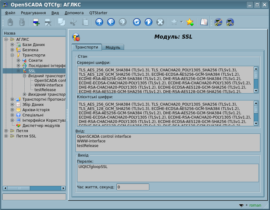 Додати нові вхідні та вихідні безпечні сокети можна за посередництвом конфігурації транспортної підсистеми у будь якому конфігураторі OpenSCADA.