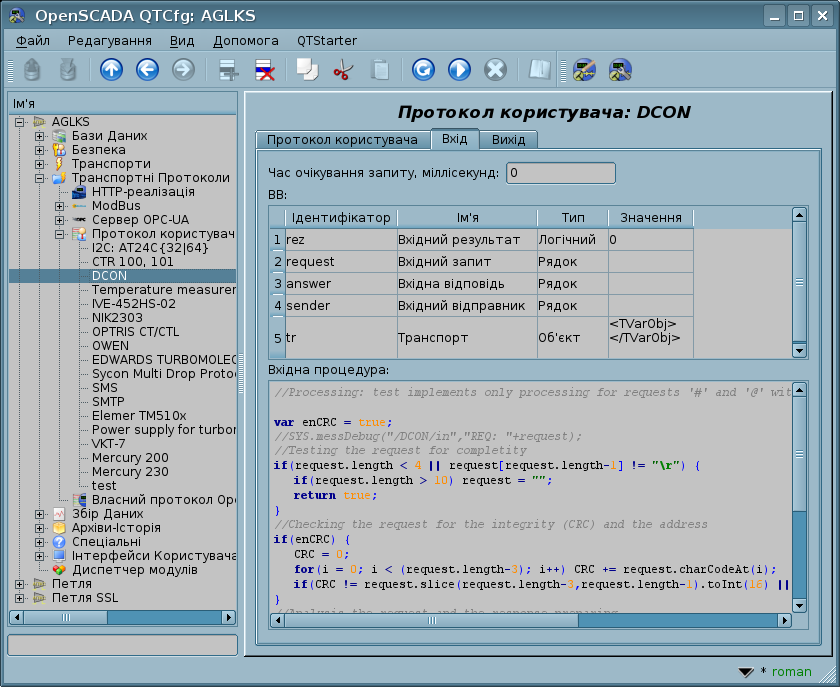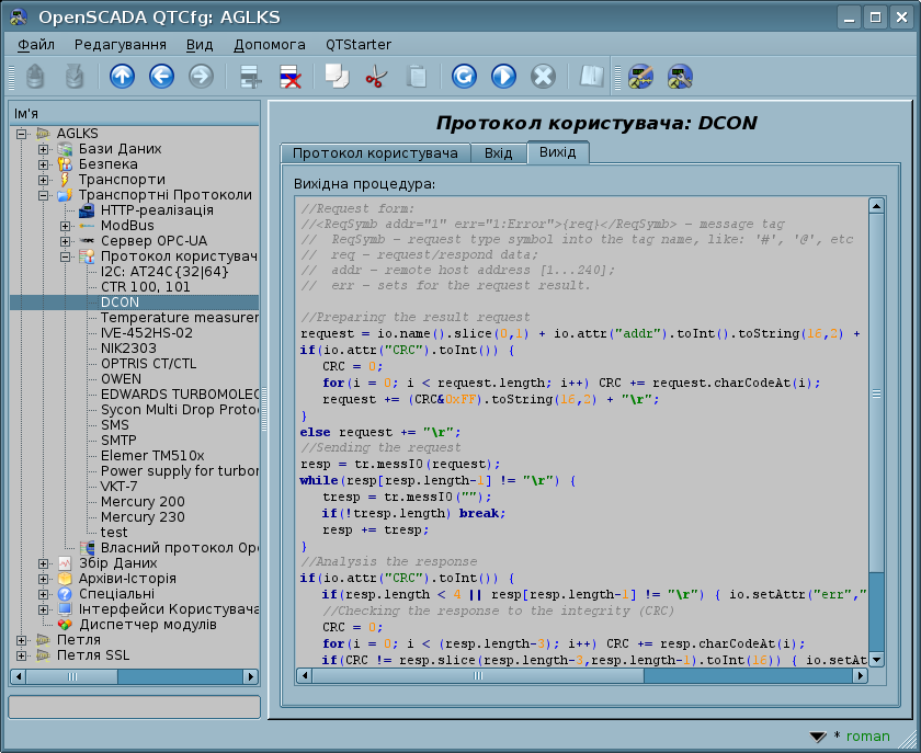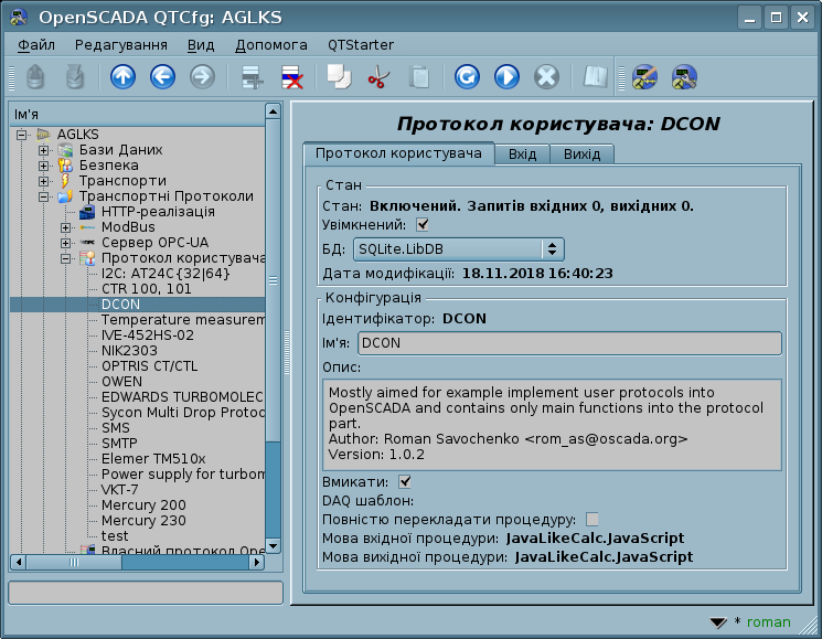 UserProtocol | Користувацький протокол | 1.6 | GPL2 | prot_UserProtocol.so | en,uk,ru,de | x86,x86_64,ARM | Протокол | Роман Савоченко | Забезпечує створення власних протоколів користувача на внутрішній мові OpenSCADA. |