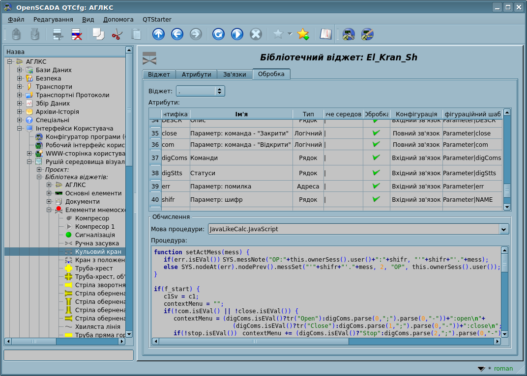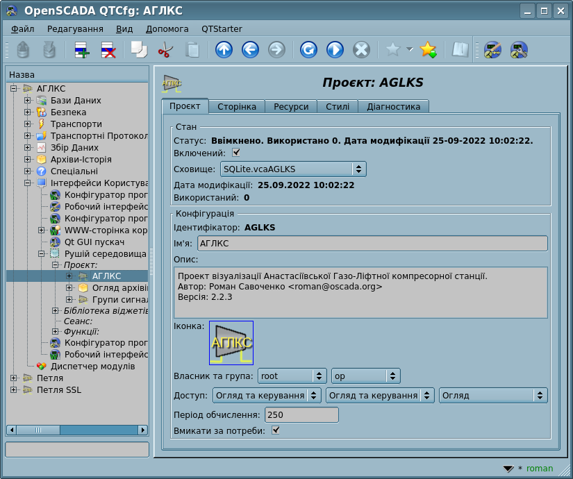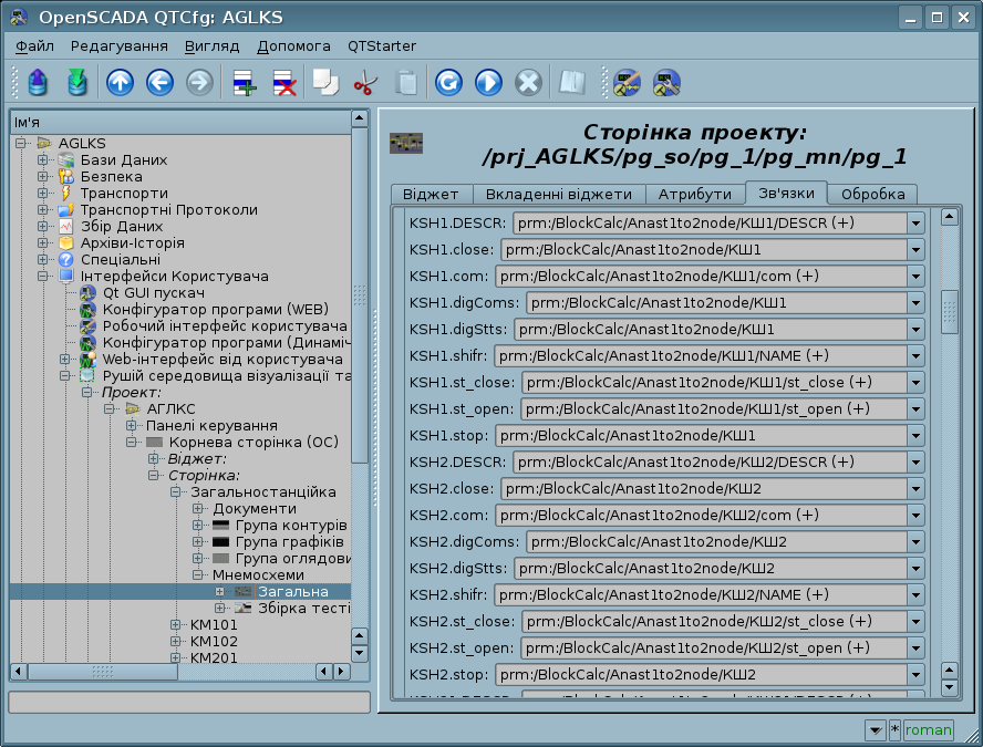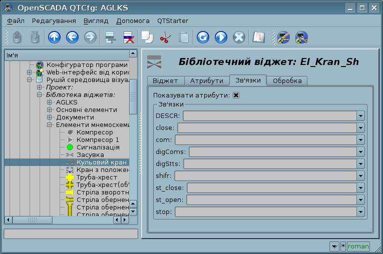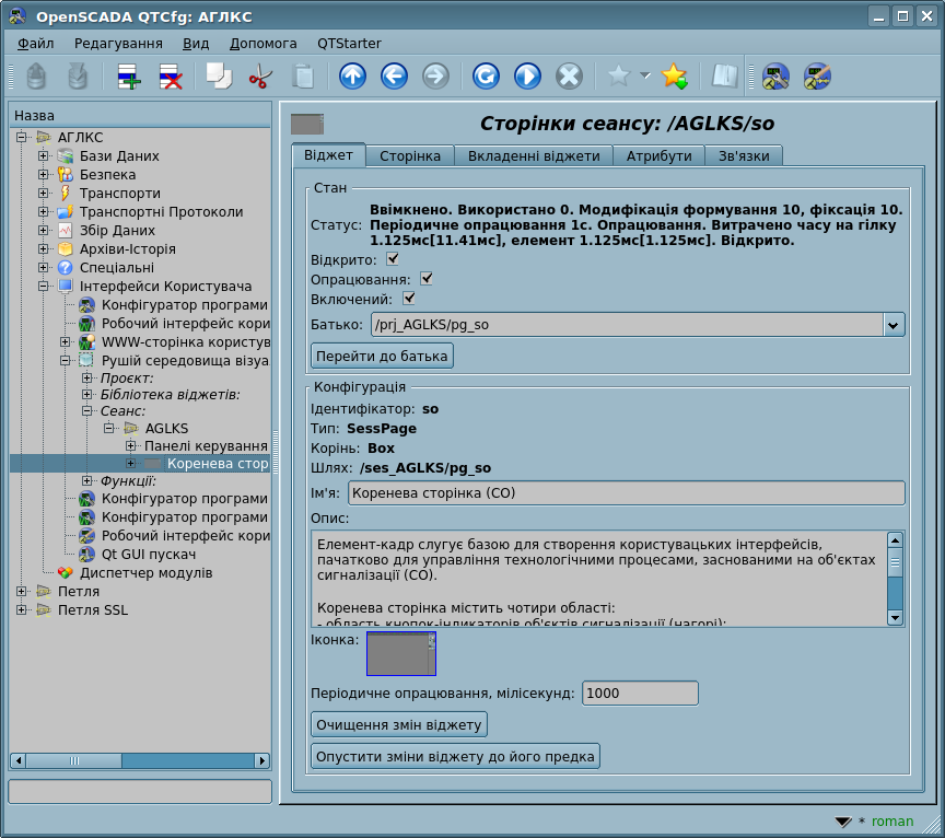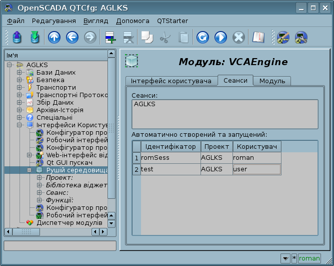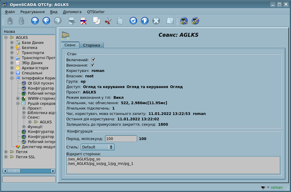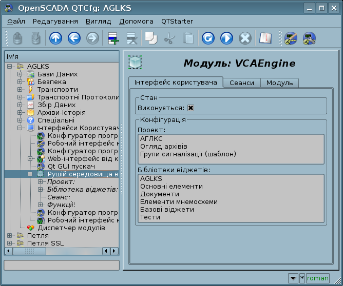 За посередництвом інтерфейсу управління OpenSCADA компоненти, які його використовують, можна конфігурувати з будь-якого конфігуратору OpenSCADA. Даним модулем надається інтерфейс доступу до всіх об'єктів даних СВУ. Головна вкладка конфігураційної сторінки модуля надає доступ до бібліотек віджетів та проєктів (рис.4.1). Вкладка "Сеанси" надає доступ до відкритих сеансів проєктів (рис.4.2).