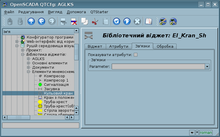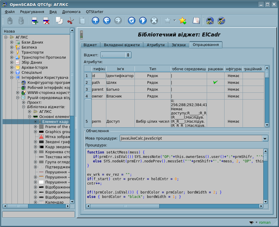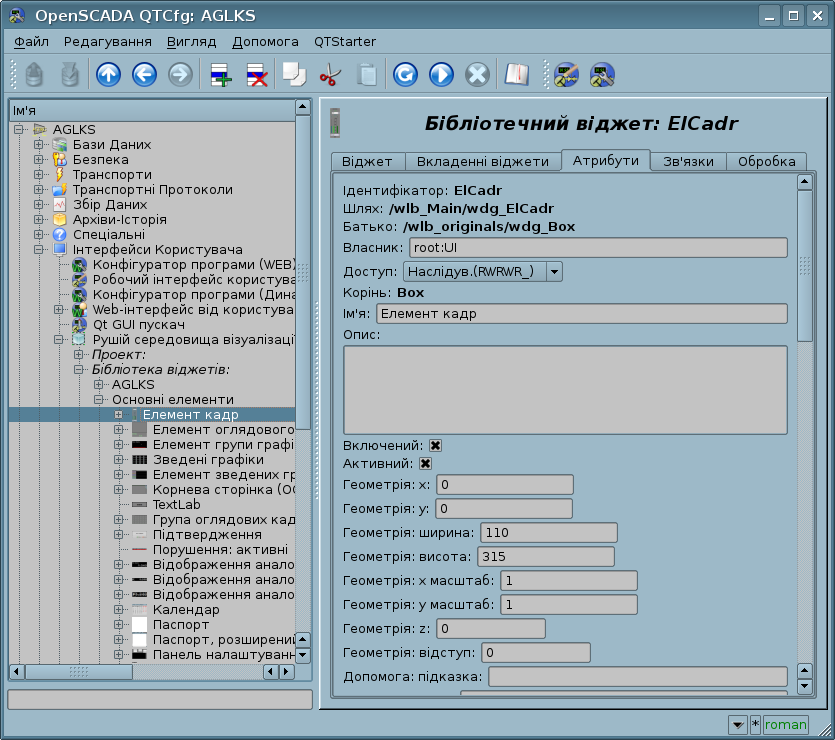 Кадри та користувацькі елементи розташовуються у бібліотеках віджетів. З елементів цих бібліотек формуються проєкти інтерфейсів кінцевої візуалізації СВУ. На основі-ж цих проєктів формуються сеанси візуалізації.