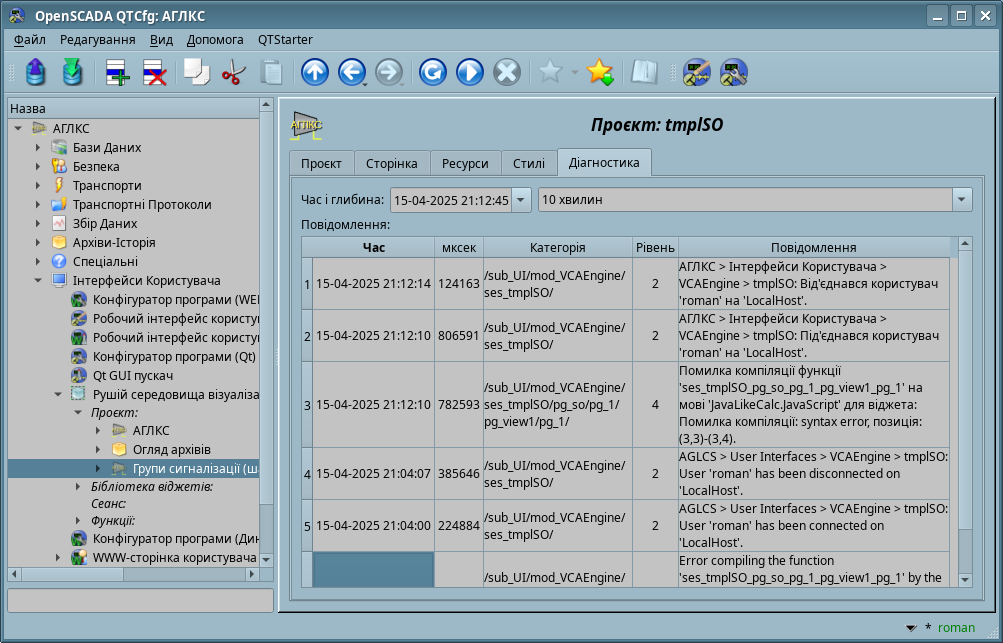 У цій вкладці можете обрати час (або оновити до поточного) та глибину для отримання діагностичних повідомлень сеансів виконання даного проєкту.