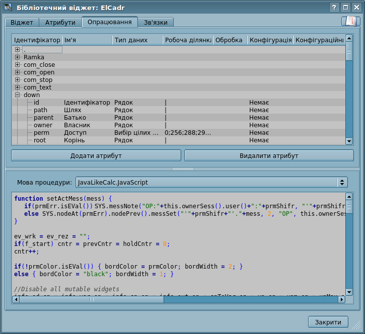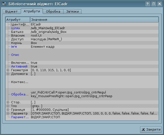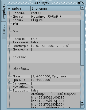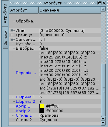Скориставшись полем "Лінія" вкладки "Атрибути", задамо ширину, колір, стиль ліній, якими будемо рисувати. За допомогою поля "Границя", задамо ширину та колір бордюру. Поле "Заповнення" дозволяє задати колір та зображення заливки. "Перелік елементів" містить перелік примітивів, що використовуються при створені графічного об'єкту. Елементи всіх полів вкладки "Атрибути" можуть динамічно змінюватися у процедурах користувача.