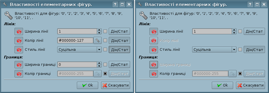 Якщо-ж діалог викликано для групи обраних фігур (рис.5.5.b), то властивості (атрибути), вказані у діалозі, будуть застосовані до всіх фігур, перелічених у заголовку діалогу. При виклику діалогу, у полях властивостей будуть відображатися дані тієї фігури з групи обраних, відносно якої було викликано контекстне меню. Існує можливість включати/виключати окремі властивості діалогу. Для цього передбачено кнопку (