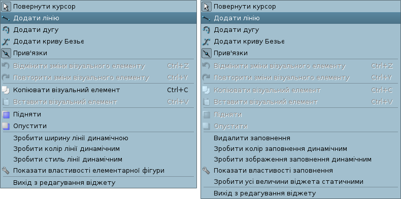 Передбачено контекстне меню, що викликається кліком правої кнопки миші у області редагованого віджету. Залежно від того, який об'єкт знаходиться під вказівником миші, контекстне меню може приймати дещо різний вид. Нижче, на рисунку 5.4, наведено приклади контекстного меню.