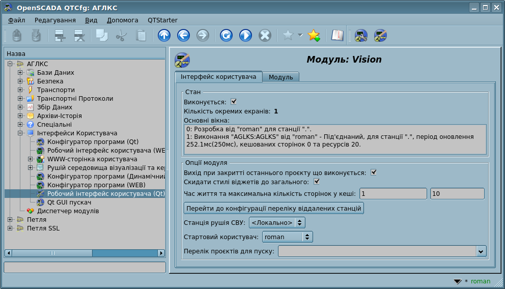 - Стан модуля: "Виконується", доступна кількість екранів у бібліотеці Qt та перелік відкритих основних вікон.