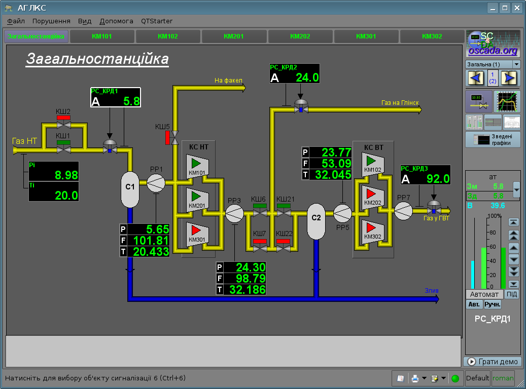 - можливість включення, до користувацьких елементів візуалізації, функцій (або кадрів обчислення функцій) об'єктної моделі OpenSCADA, практично зв'язуючи представлення з алгоритмом обчислення; наприклад, візуалізуючи бібліотеку моделей апаратів ТП, для подальшої візуальної побудови моделей ТП;
