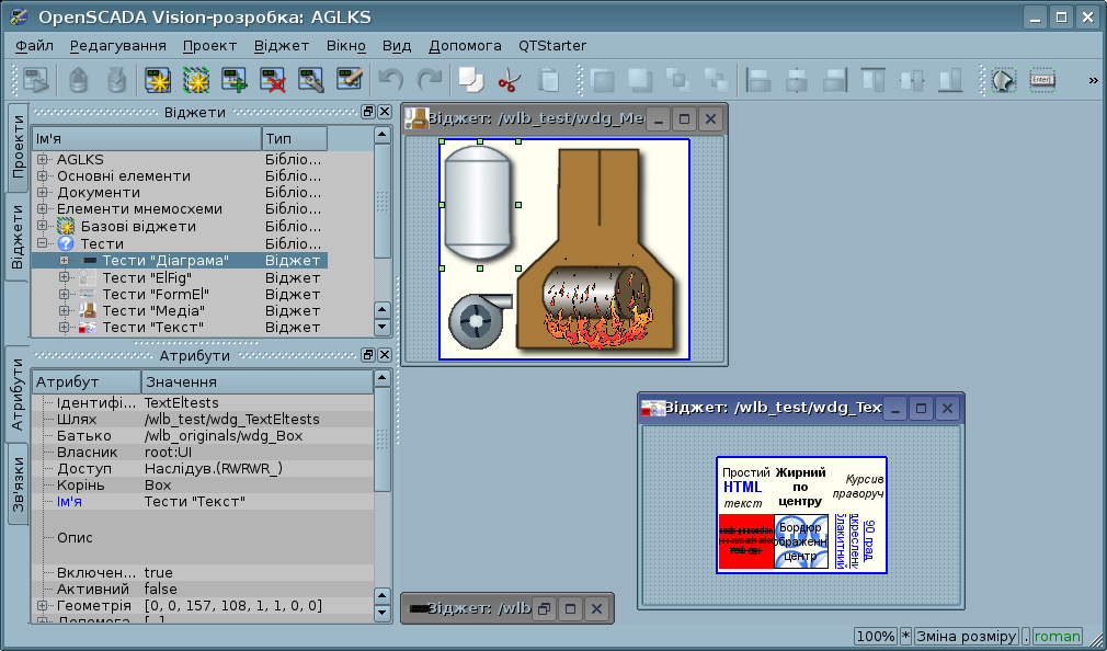 Для того щоб приступити до роботи з графічним редактором, після запуску проєкту OpenSCADA, необхідно викликати "Робочий користувацький інтерфейс (Qt)". У вкладці "Віджети" міститься перелік існуючих графічних бібліотек та елементів, що їм належать.