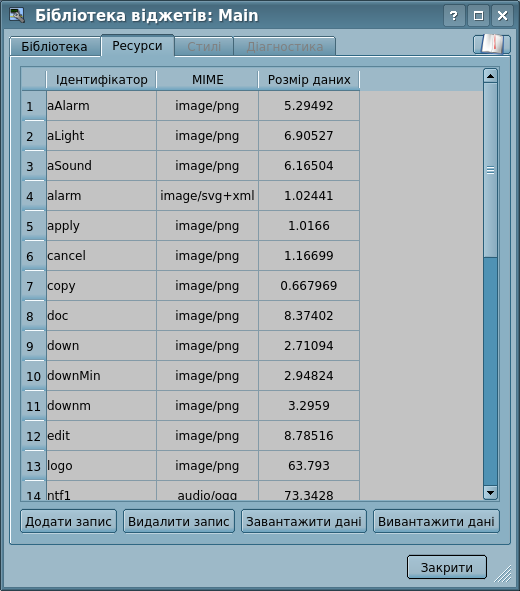 - "Видалити візуальний елемент" — видалення візуального елементу з бібліотеки.