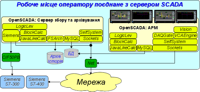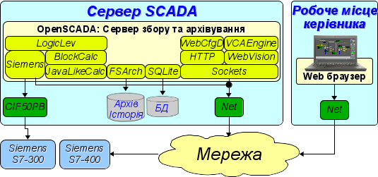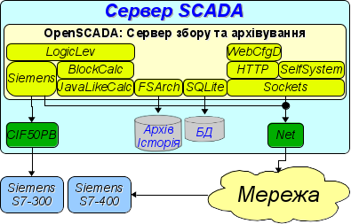 У простішому випадку OpenSCADA можна сконфігурувати у серверному режимі (Рис.3.1) для збору та архівування даних. Така конфігурація дозволяє виконувати наступні функції: