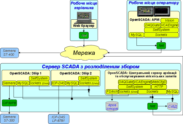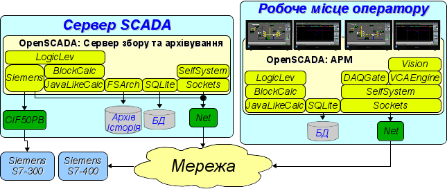 Для доступу клієнтів до серверу використовуються доступні у OpenSCADA мережеві транспорти, на прикладі — Sockets; та транспортні протоколи, на прикладі — протокол OpenSCADA "SelfSystem".