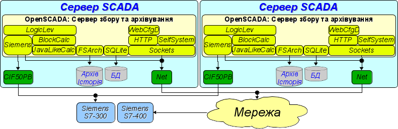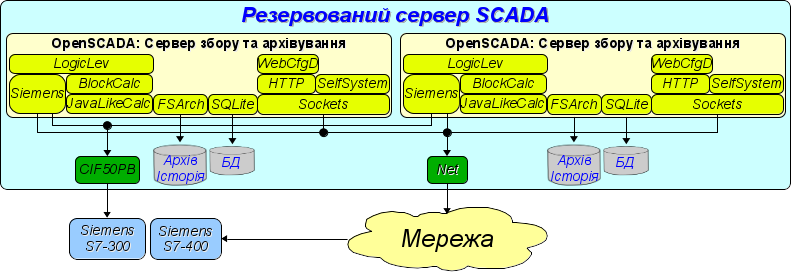 Для підвищення надійності та продуктивності OpenSСADA допускає множинне резервування (Рис.3.2), при якому джерела даних (контролери) та архіви-історія одного екземпляру відбиваються у іншому. При використанні подібної конфігурації можливий розподіл навантаження опитування/обчислювання по різними станціями. Така конфігурація дозволяє виконувати функції: