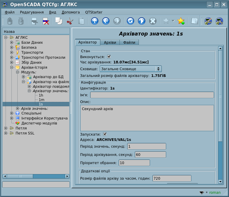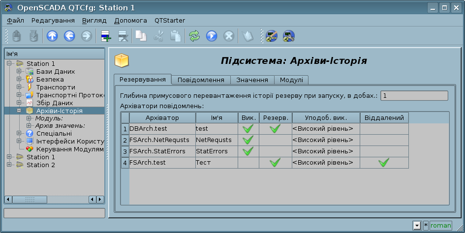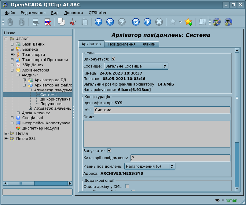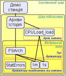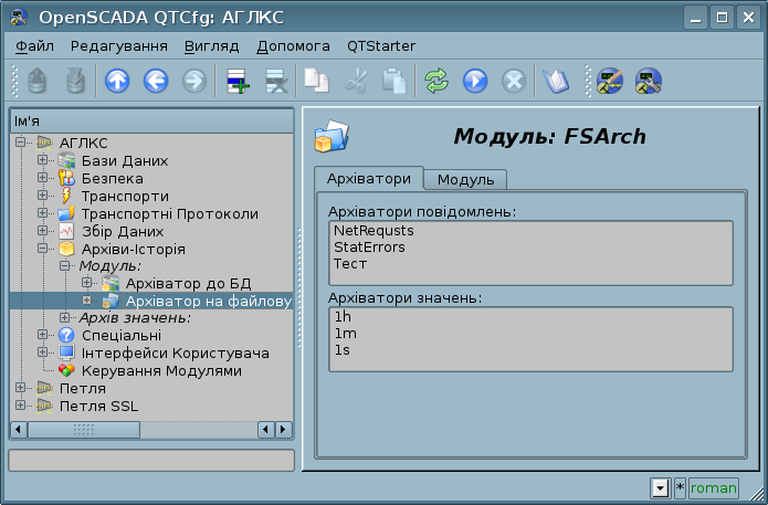 Для вирішення задач архівування потоків даних у OpenSCADA передбачено підсистему "Архіви-Історія" (Рис.1.5), яка є модульною та дозволяє вести архіви повідомлень та значень. Модульним об'єктом, який міститься у підсистемі "Архіви-Історія", виступає тип архіватору. Тип архіватору визначає спосіб зберігання даних тобто сховище — файлова система, СУБД. Кожен модуль підсистеми "Архіви-Історія" відповідно може реалізовувати архівування повідомлень та значень та сама підсистема може містити багато архівів, які обслуговуються різними модулями.