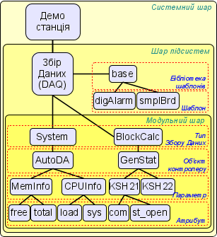 Окремо взятий об'єкт контролеру може містити параметри визначених модулем типів. Наприклад, параметри аналогового типу, основною інформацією яких є значення цілого або реального типу. Структурно параметр представляє собою перелік атрибутів, які й містять дані. Атрибути можуть бути п'яти базових типів: логічний, цілий, реальний, символьний рядок(текст) та об'єкт. Структури об'єктів контролерів, параметрів та їх типів містяться у підсистемі "Збір даних", а об'єкти модулів здійснюють їх заповнення згідно зі власною специфікою.
