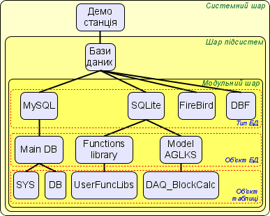 Тип БД/СУБД своєю чергою містить перелік об'єктів окремих БД цього типу, а об'єкт БД містить перелік об'єктів таблиць, які й містять дані у табличній формі.