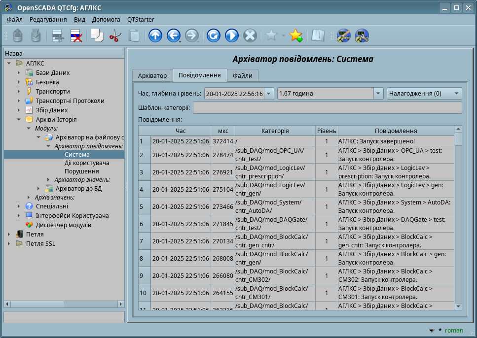Суворої структури категорії та тексту повідомлення не передбачається та користувач, для власних повідомлень, може формувати їх довільно, але варто враховувати структуру системних повідомлень та повідомлень, визначених стандартними бібліотеками OpenSCADA, щоб попередити перетин з ними, або предметно розширити: