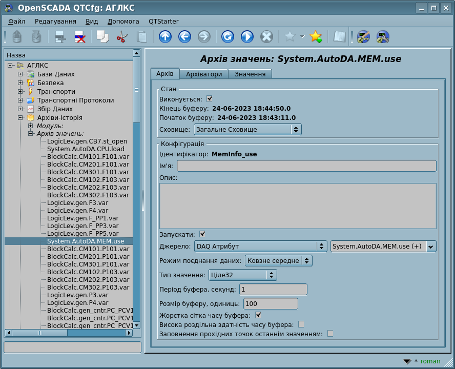 Ключовим компонентом архівування значень неперервних процесів є буфер значень, який призначено для проміжного зберігання масиву значень, отриманого з визначеною періодичністю (квантом часу). Буфер значень використовується для безпосереднього зберігання великих масивів значень у архівах значень як перед безпосереднім "скиданням" на фізичний носій, так і для маніпуляцій з кадрами значень, тобто у функціях покадрового запиту значень та їх розташування у буфері архівів.