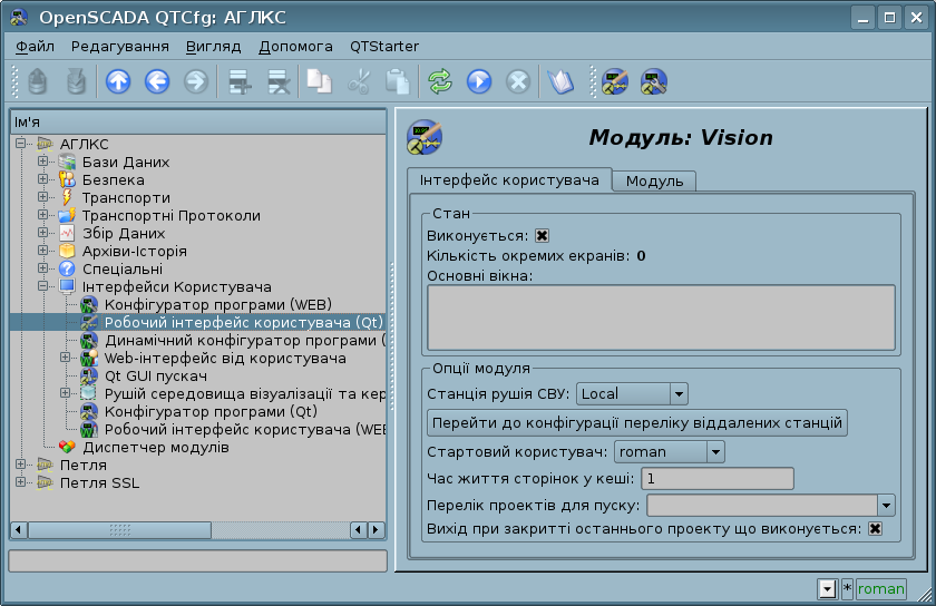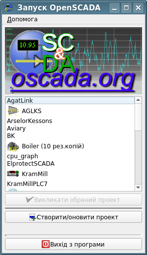 Створити новий проєкт можна з локального графічного інтерфейсу UI.QTStarter (Рис.5c) та через сценарій командного рядку менеджеру проєктів openscada-proj, який власне і викликається з локального графічного інтерфейсу.