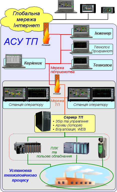 Робоче місце технологу: суцільно включає у себе функції робочого місця оператору плюс моделі технологічних процесів (без безпосереднього зв'язку з технологічним процесом).